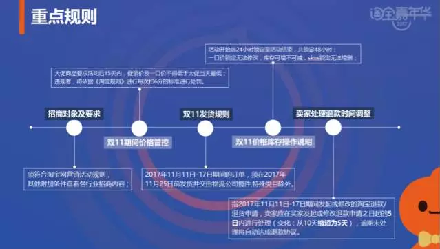 发货规则:跟去年一样的,但是有一个变化,在卖家退款时间调整上面比去年缩短了,原来是10天,现在是5天,逾期未处理会自动达成退款协议的。