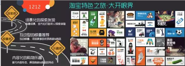 淘宝嘉年华更大程度上是把一年积累的熟客,通过最大力度的优惠让货品在一天里面集中爆发。双12会增加一种新的体验,通过特色的商家商品、特色的内容,帮助商家吸引新的用户,为用户一场截然不同的特色之旅。为此我们需要发掘最具特色的店铺,商家也都需要拿出“镇店之宝”,拿出最具特色的商品。
